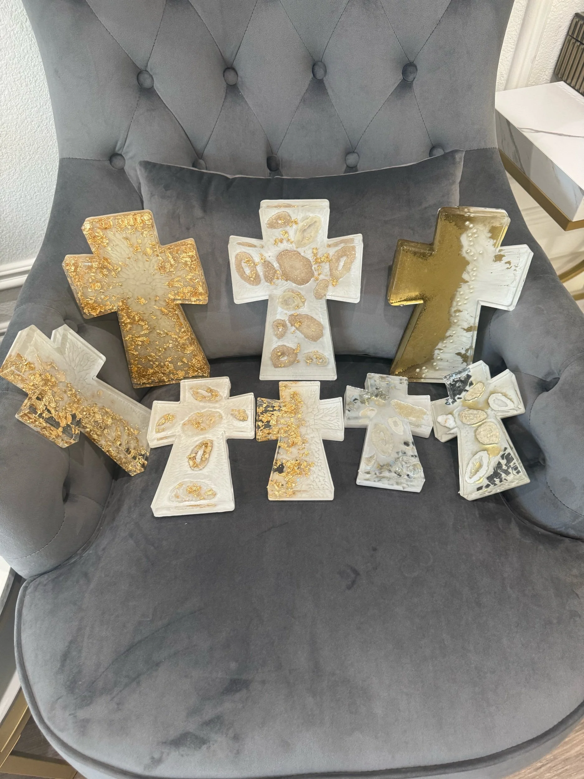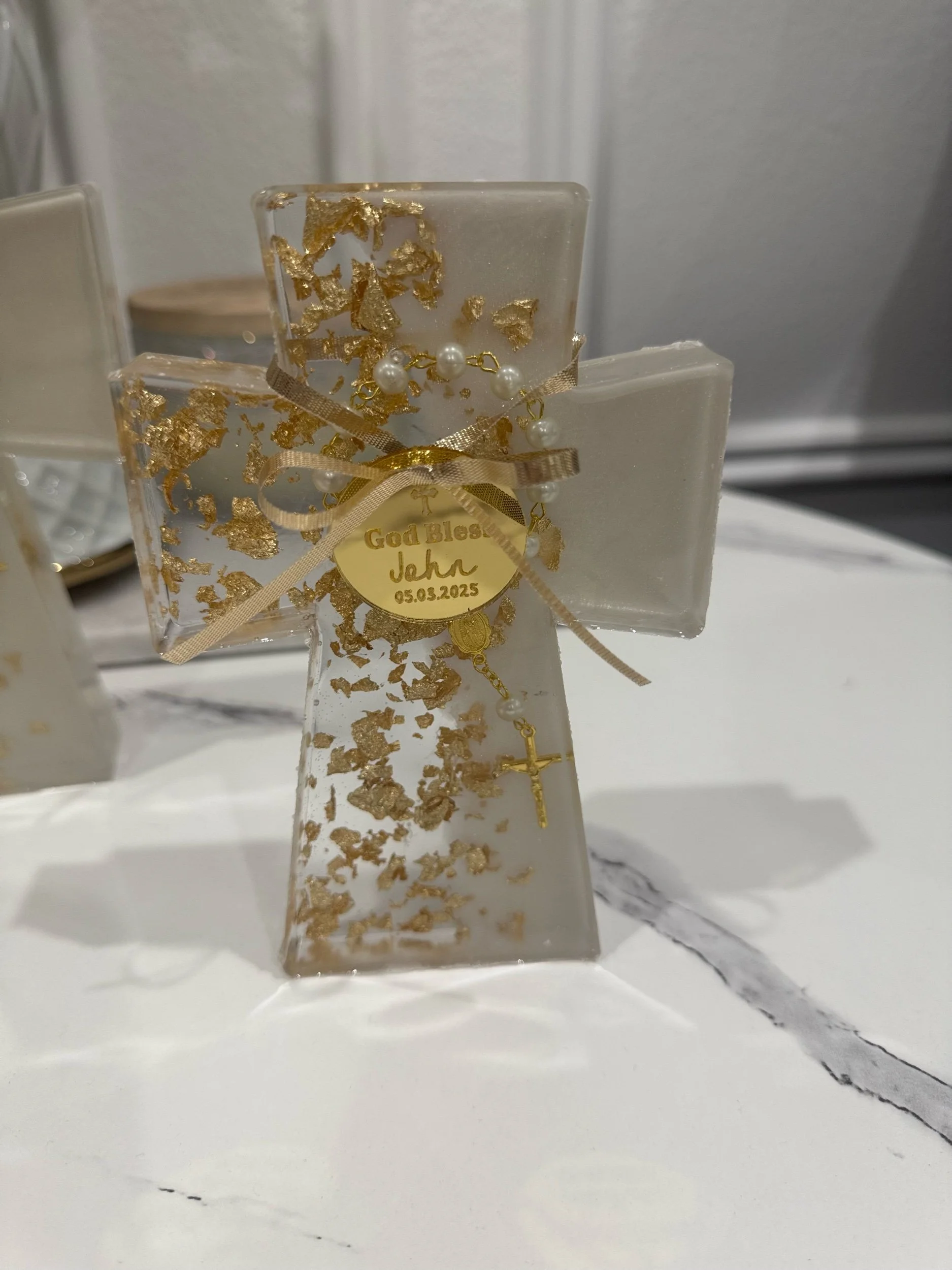 6.25 inch height cross. It can be made in various Color combinations. This piece can be used as a party favor for Communions and Baptisms!