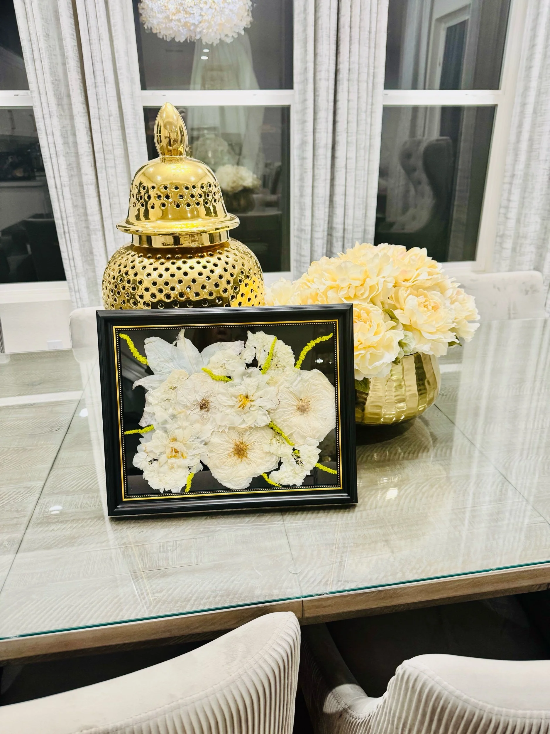 Shop › Black and Gold Pressed Flower Frame Image 1 of 4 Image 2 of 4 Image 3 of 4 Image 4 of 4 Black and Gold Pressed Flower Frame $475.00 11 inch x 14 inch Black and Gold Frame Quantity: Add To Cart Added! 11 inch x 14 inch Black and Gold Frame